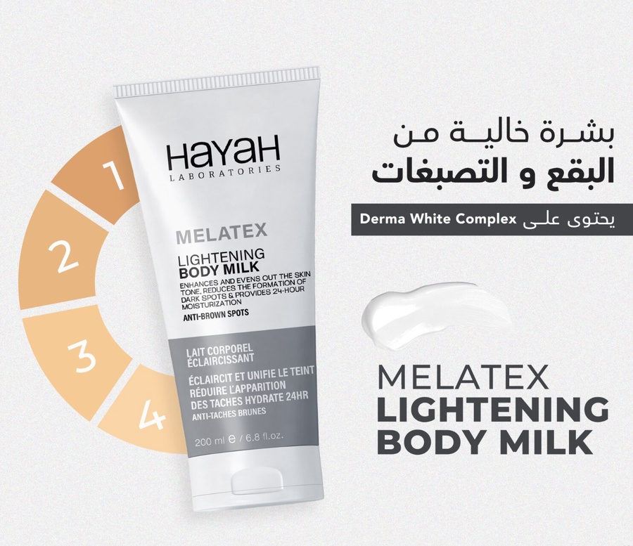 كريم ميلاتكس بيشتغل بتركيبته المتطورة على تفتيح البقع الداكنة وتجديد الخلايا وده بيرجعلك بشرة أفتح وأنعم بشكل طبيعي ومتوازن من غير ما تضطري تغطيها والكريم بيوصل لأعمق طبقات الجلد ويفتح الأماكن الغامقة الصعبة ويخلي لونها قريب من باقي الجسم